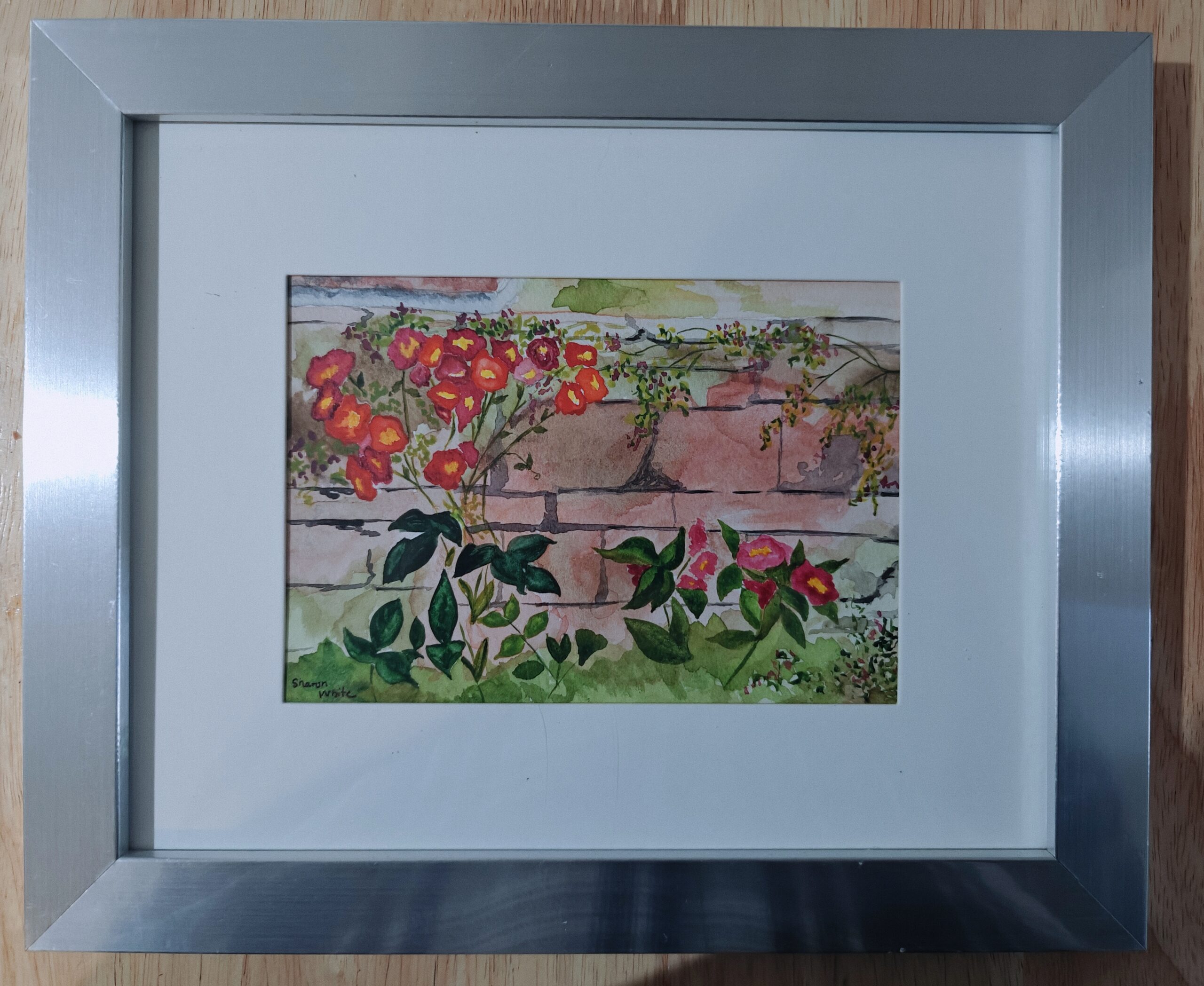 While traveling in the south of France, everywhere I looked there were old brick walls adorned with every type of climbing flower making the old and crumbling look glorious and festive! Perhaps a lesson for life! This watercolor painting measures 5″ x 7″ in an 8″ x 10″ frame. Whenever you feel old and crumbly…..remember a few bright touches and you too can be glorious and festive!!
