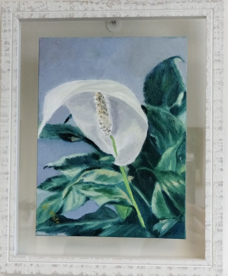 Be inspired by this lone white peace lily amidst its lush foliage. This oil on canvas painting measures 6″ x 8″ and is mounted on a 9″ x 12″ floating framed.